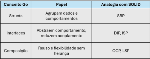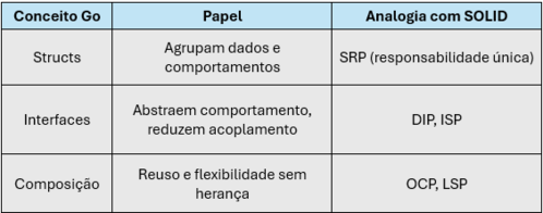 - Também ao Liskov Substitution Principle (LSP): em Go, substituibilidade é alcançada via interfaces + composição, não herança.