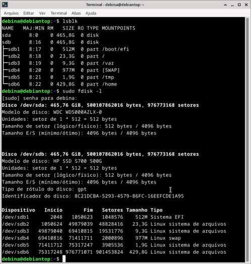 Na saída do comando fdisk -l também podemos ver se é gpt ou mbr e podemos ver o identificador do disco, no caso, o UUID, aquele numerozão. Para ser mais específico pode se executar:
