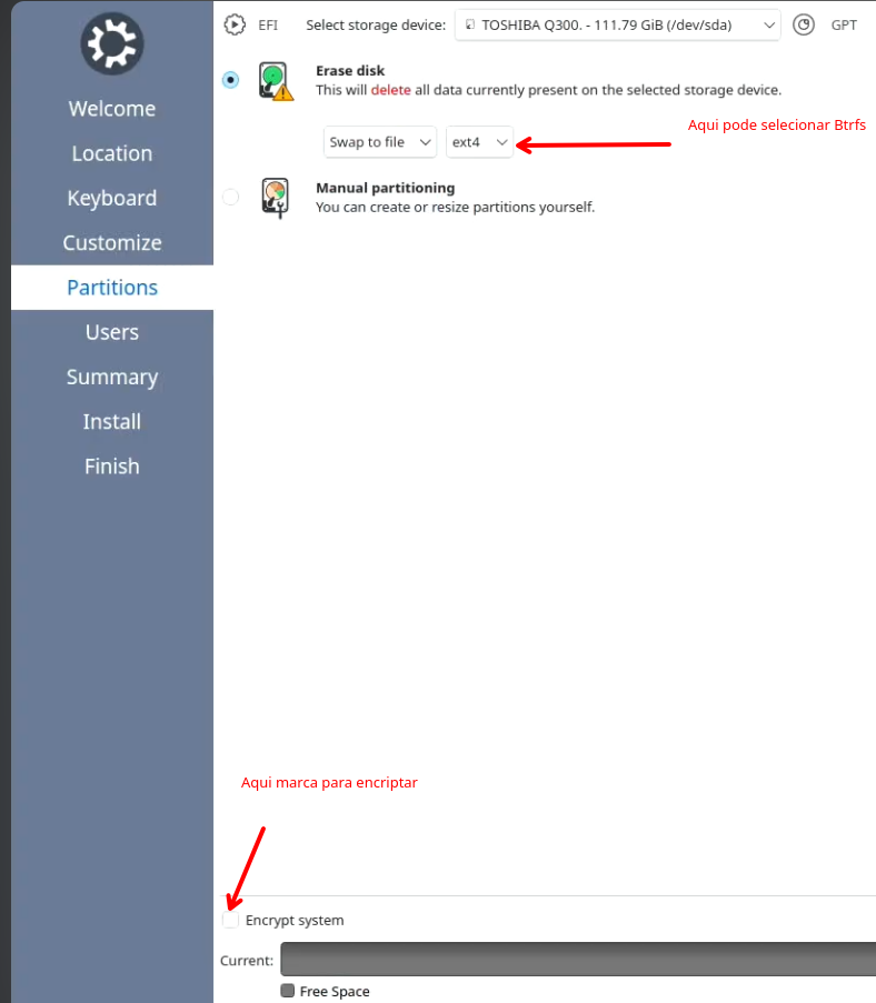 Ubuntu 26.04 não tem opção para fazer criptografia de disco LUKS + sistema de arquivos Btrfs. O padrão dele é Ext4.