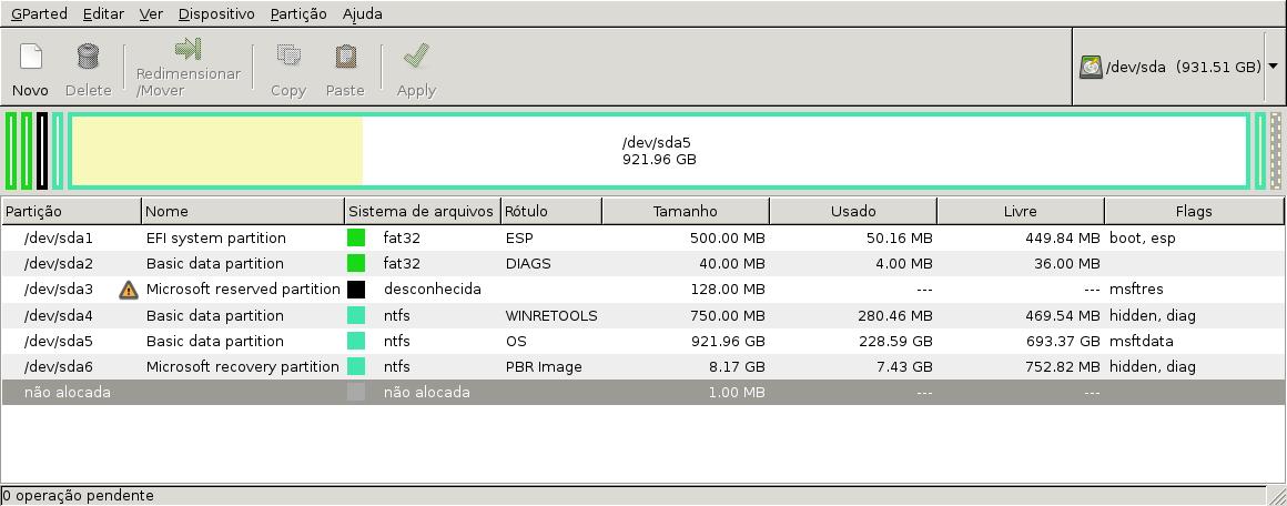 Já o GPARTED parece apontar esse particionamento atual de forma mais detalhada: