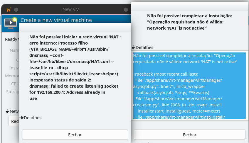 error: erro interno: Processo filho (VIR_BRIDGE_NAME=virbr0 /usr/sbin/dnsmasq --conf-file=/var/lib/libvirt/dnsmasq/default.conf --leasefile-ro --dhcp-script=/usr/lib/libvirt/libvirt_leaseshelper) inesperado status de saída 2: