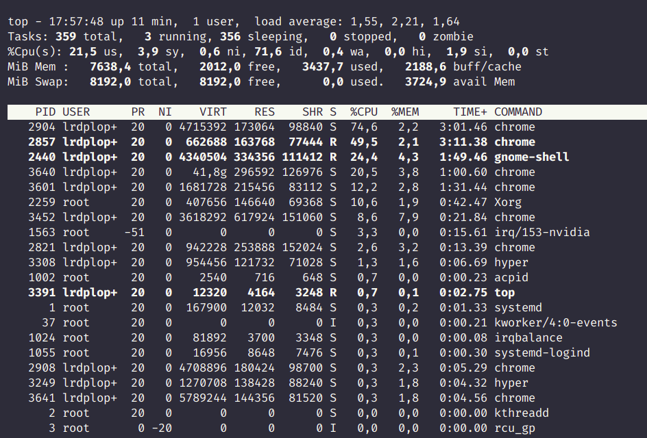 Formatei meu Windows para Linux tem algumas semanas e venho percebendo um travamento / lentidão muitas vezes acima do normal. Minha máquina está praticamente limpa com relação a espaço, tenho poucos programas instalados e utilizo o básico no dia a dia. Por exemplo, Chrome para tutoriais e VSCode. Ainda sim, após umas 2 horas de uso, começa a travar de uma forma chata.