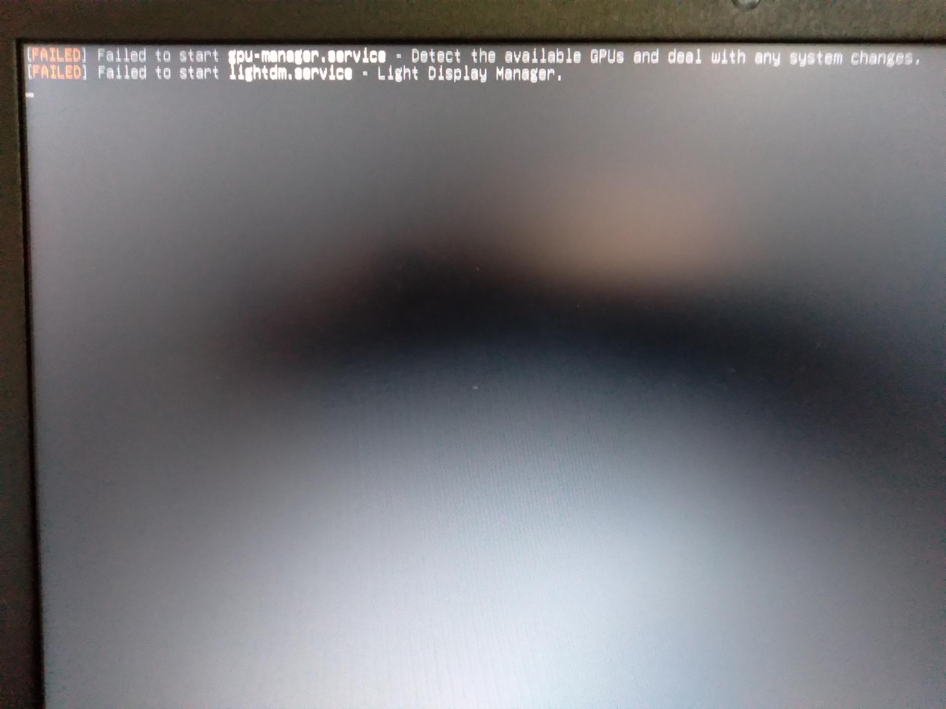 - Ao iniciar pelo cartão (seja em modo normal ou de compatibilidade, em modo bios (legacy) ou em modo uefi), ocorre o erro "failed to start gpu-manager.service" e "lightdm.service" (mostrados na figura).
