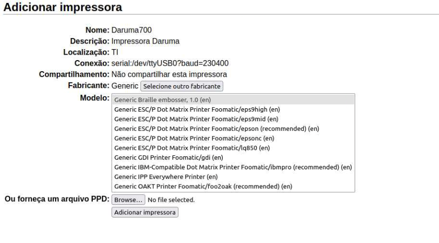 Estou tendo dificuldades para achar um driver para a impressora Daruma700 D-Printer, testei todas as opções de driver pelo CUPs mas não obtive sucesso, mesmo criando uma PPD não funcionou. Tenho pouca experiência com Linux e precisava desse apoio.