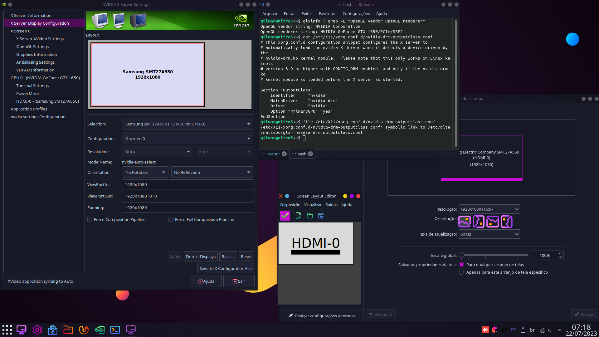 Na imagem vc poderá ver a configuração na perspectiva de diferentes utilitários. NVIDIASettings / arandr / configuração de tela do KDE