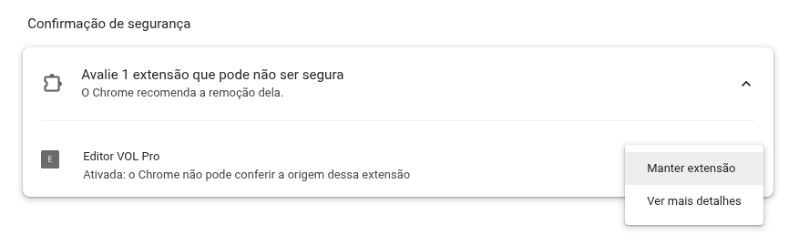 Aviso de Segurança: O Chrome exibirá uma barra informando "Avalie 1 extensão que pode não ser segura". Clique na opção correspondente e selecione "Manter extensão".