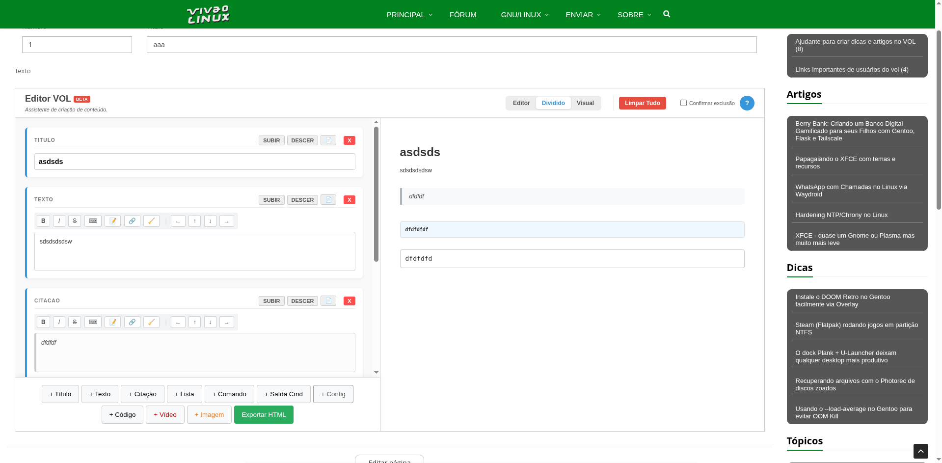 Atualiza a página e vê se vai aparecer o editor embutido na página de dica ou artigo.